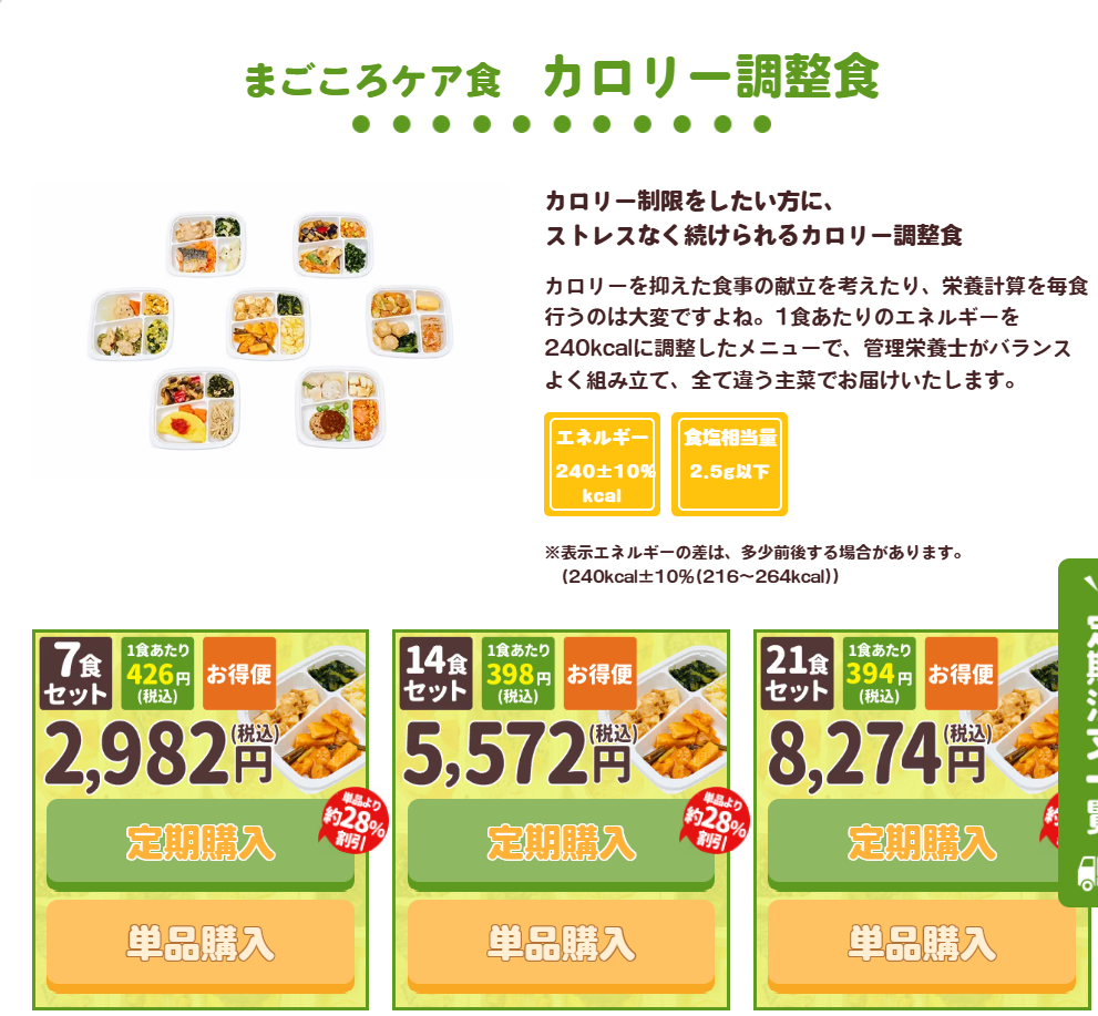 メリットの項でも後述しますが「まごころケア食」は定期便前提のセットだったりもするので、定期便にしないとコストのうま味はあまりありません。